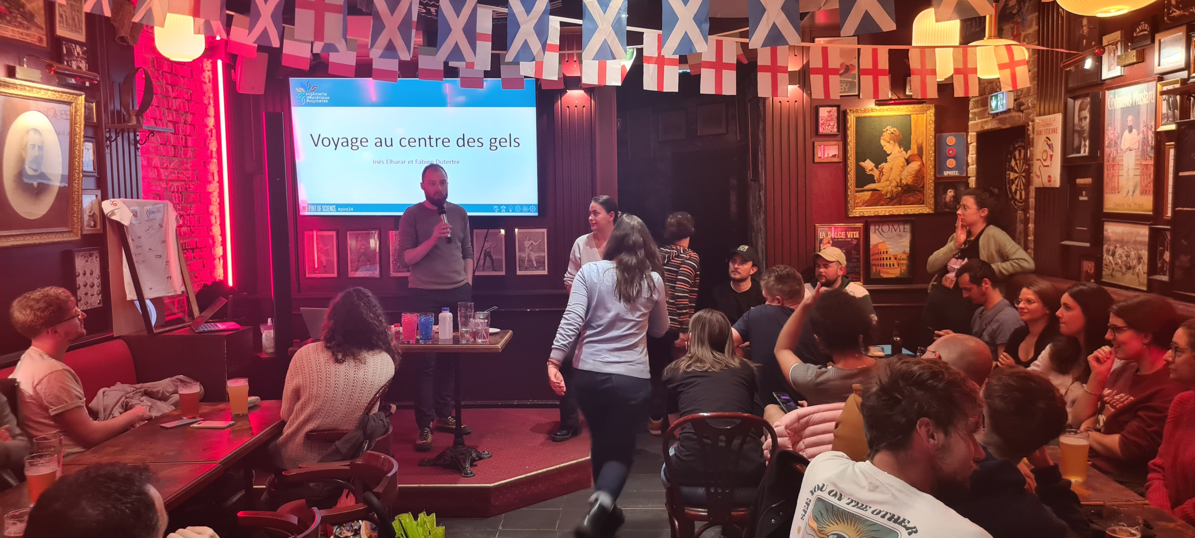 De la recherche d'intervenant.es au repérage des bars, l'équipe organisatrice chapote la face cachée du festival. Rassemblés par une passion pour les sciences et pour la vulgarisation au grand public, ils partagent aussi des moments de partage avant même le festival. Lors du festival, ils accompagnent les intervenant.es et animent les soirées. Et ce ne sont pas les animations qui manquent ! Un quizz généraliste sur les sciences permet d'attiser la curiosité des participants, qui participent ensuite par exemple à un Cluedo sur les roches (présentation de Maeva Darnault, Doctorante - Laboratoire LGL-TPE, Université de Lyon et Université Jean Monnet).