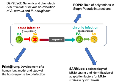 Nous avons précédemment analysé les différentes interactions entre S. aureus et P. aeruginosa dans le contexte d’infections pulmonaires chroniques, et établi leur impact. Nous explorons actuellement l’évolution des souches lors d’infections chroniques (comme dans la mucoviscidose) afin d’identifier les caractéristiques phénotypiques et génomiques liées à cette évolution.