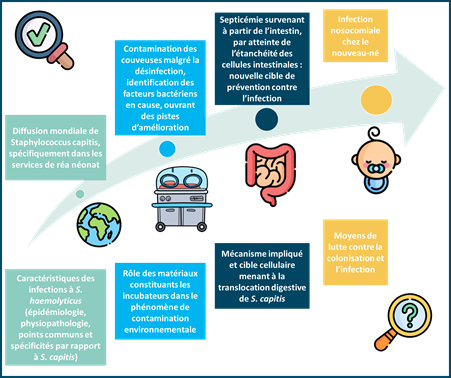 La survenue d'une infection nosocomiale est une complication fréquente chez les grands prématurés hospitalisés, et est responsable d'un risque vital et de séquelles notamment neurosensorielles et pulmonaires. Les staphylocoques à coagulase négative sont les premiers pourvoyeurs de ces infections, en particulier S. capitis et S. haemolyticus.